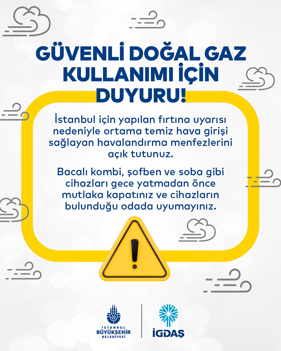 Duyuruda, bacalı kombi, şofben ve soba gibi cihazların gece yatmadan önce mutlaka kapatılması istendi. Ayrıca, bu cihazların bulunduğu odada uyumaktan kesinlikle kaçınılması gerektiği belirtildi. Açıklamada, “İstanbul için yapılan fırtına uyarısı nedeniyle ortama temiz hava girişi sağlayan havalandırma menfezlerini açık tutunuz. Bacalı kombi, şofben ve soba gibi cihazları gece yatmadan önce mutlaka kapatınız ve cihazların bulunduğu odada uyumayınız” ifadelerine yer verildi.