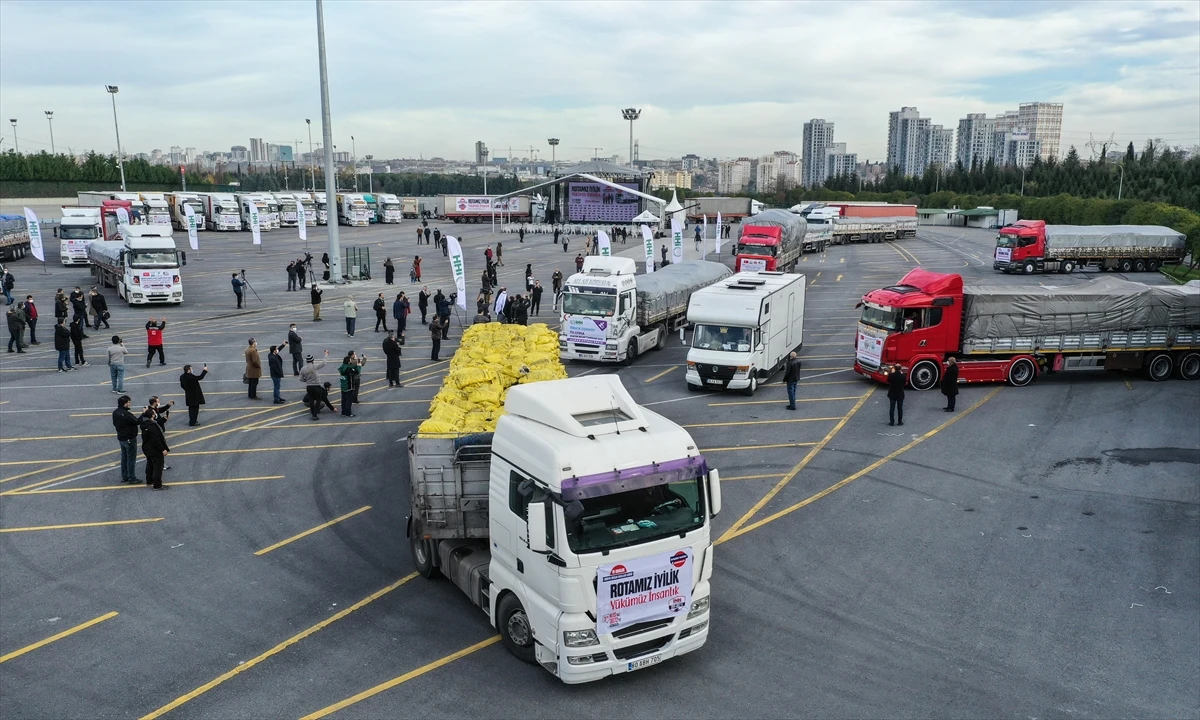 İHH tarafından Başakşehir Atatürk Olimpiyat Stadı otoparkında düzenlenen törenle 50 tır, toplamda ise 350 yardım tırı eş zamanlı olarak Suriye'ye uğurlandı.