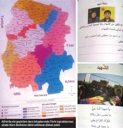 Eğitim müfredatı bizzat Kandil merkezli PKK tarafından dikte ediliyor. Kitaplarda çocukların zihnine, ‘Başöğretmen Öcalan’ sloganı’ işleniyor. Kitaplardaki çeşitli bölümlerde PKK elebaşına ait alıntılar da yer alıyor. PYD/PKK’nın okuttuğu “Toplumsal Bilimler” kitabının kapağında ve 6. sınıflara okutulan “Kürt Dili kitabının” 27. ve 38. sayfalarında, PKK üniforması olarak bilinen giysilerle görünen çocuk fotoğrafları yer alıyor. Çocuklara “Ben şehidim” marşları ezberletiliyor. Bazı kitaplarda ise Hristiyanlık ve Zerdüştlük propagandası yapılıyor.