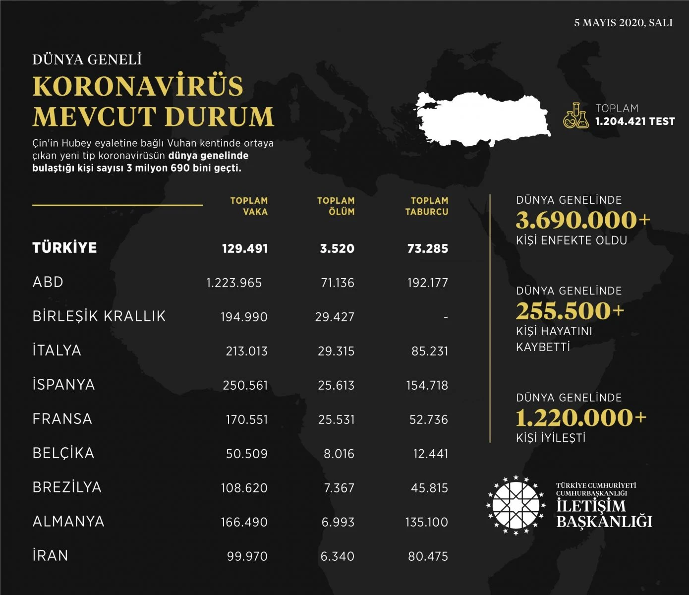 Başkanlığın Twitter hesabından yapılan paylaşımda, Çin'in Hubey eyaletine bağlı Vuhan kentinde ortaya çıkan Kovid-19'un dünya genelinde bulaştığı kişi sayısının 3 milyon 690 bini geçtiği, 255 bin 500'den den fazla kişinin hayatını kaybettiği, 1 milyon 220 binden fazla kişinin iyileştiği belirtildi.