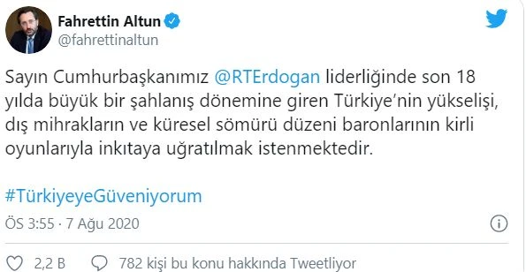 İletişim Başkanı Fahrettin Altun'dan ekonomiye yönelik açıklamalar geldi. Altun, "Son dönemde, kur oyunları üzerinden doğrudan ekonomimizi hedef alan saldırıların kimler tarafından organize edildiği çok iyi bilinmektedir. Türkiye, salgın sürecinde yürütmüş olduğu başarılı sağlık ve ekonomi sistemiyle tüm dünyaya örnek olmuştur." dedi.