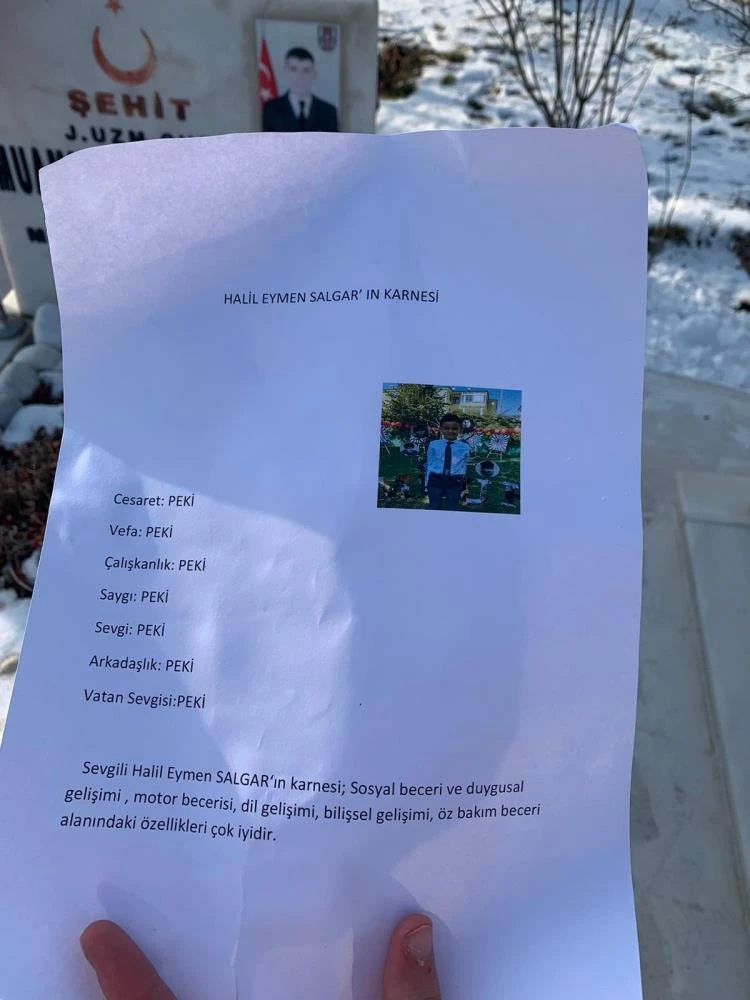 Şehit Salgar, 7 aylık bebeği Halil Eymen’i sadece 2 kez görmüştü. Anaokulunda eğitim görmeye başlayan 5 yaşındaki Halil Eymen Salgar bugün karnesini aldı. Karnesini alan Halil Eymen, annesi ile birlikte Elazığ Granizon Şehitliği'ne giderek babasının mezarına koştu. Küçük Halil Eymen, babasının kabri başına gelip karnesini gösterdi. Eymen’nin karnesinde cesaret, vefa, çalışkanlık, saygı, arkadaşlık ve vatan sevgisinin ‘PEKİ´ olması dikkat çekti.