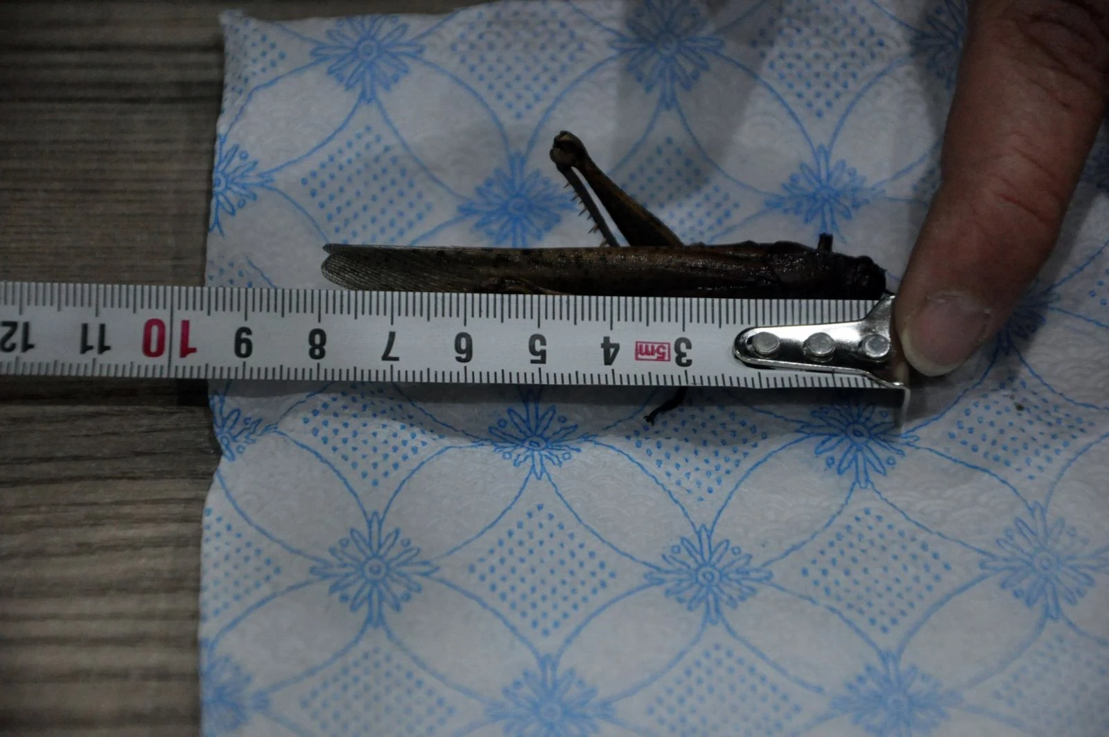 Eline aldığı peçeteyle çekirgeyi yakalayan Kartal, “Bu mevsimde çekirgenin Yüksekova’da olması beni çok şaşırttı. Büyük ihtimal bu İran ve Irak’tan gelmiş olmalı. Ben metreyle ölçtüm, tam 8 santimetre uzunluğundadır. Allah’tan şimdi havalar soğuk, yoksa gelirlerdi” dedi.
