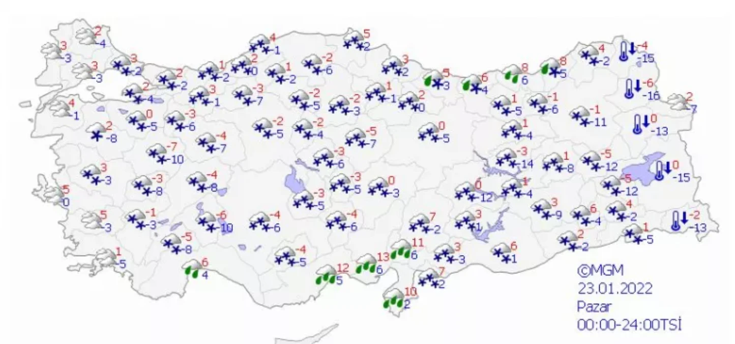 Pazar günü kar bulutları daha geniş bir alana yayılacak. Batı Trakya ve Adana, Hatay çevreleri, Çanakkale, Muğla ve İzmir dolayları hariç neredeyse tüm bölgelerde kar yağışı etkili olacak.