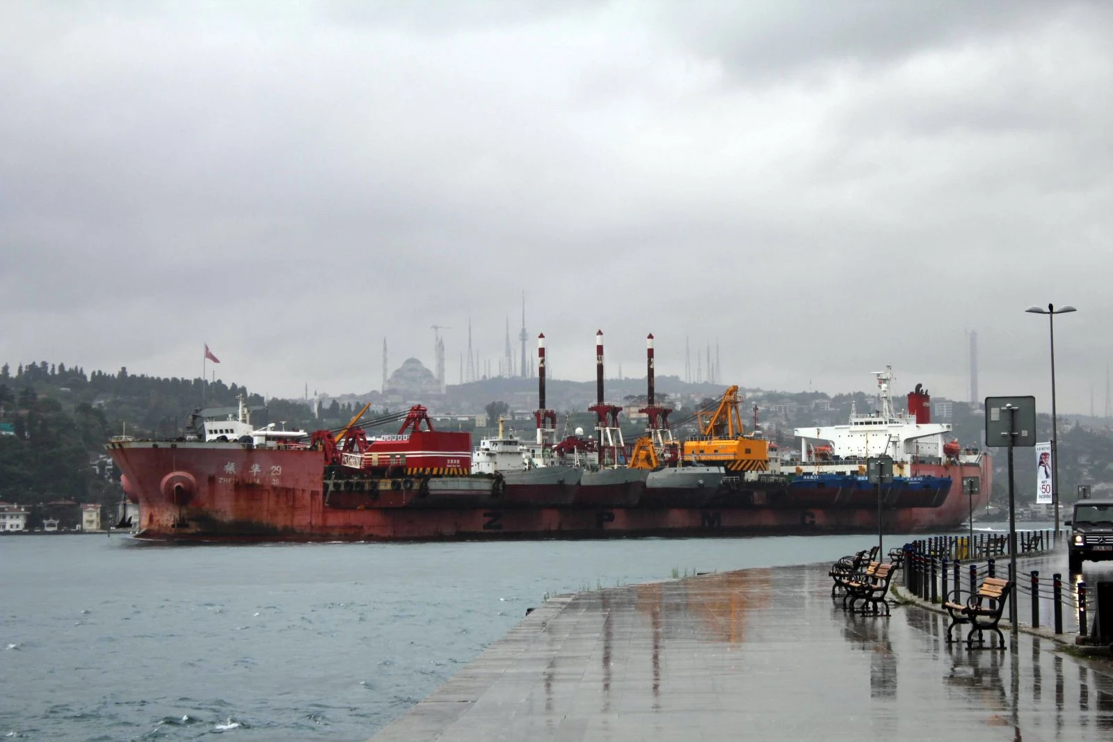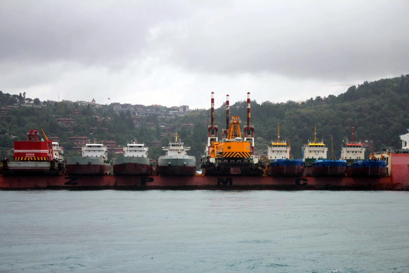 İstanbul Boğazı dün öğle saatlerinde ilginç bir manzaraya şahit oldu. Hong Kong bayraklı “Zhen Hua 29” isimli dev nakliye gemisi Kıyı Emniyet Genel Müdürlüğü’ne bağlı 2 römorkörün eşliğinde Marmara Denizi’nden İstanbul Boğazı’na girdi. Dev geminin üzerinde taşıdığı 10 adet gemi ilginç bir görüntü oluşturdu. Yaklaşık 1 saatte Boğaz'dan geçişini tamamlayan gemi daha sonra Karadeniz'e doğru açıldı.
