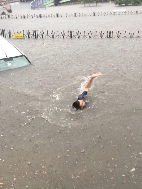 Üsküdar'da çekildiği belirtilen ve DHA whatsapp hattına ulaştırılan görüntüde su dolan yolda bir kişinin yüzerek işyerine ulaşmaya çalıştığı görülüyor.
