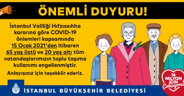 ''İstanbul Valiliği Hıfzıssıhha kararına göre Covid-19 önlemleri kapsamında 15 Ocak 2021'den itibaren 65 yaş üstü ve 20 yaş altı tüm vatandaşlarımızın toplu taşıma kullanımı engellenmiştir.