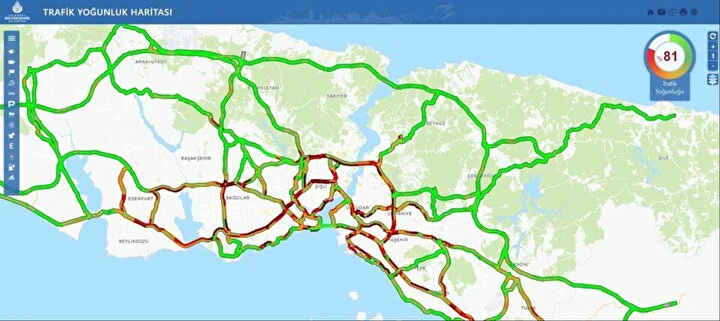 Trafik yoğunluğu saat 17.00 itibariyle İstanbul Büyükşehir Belediyesi Cep Trafik uygulamasında trafiğin yüzde 81 olduğu görüldü.