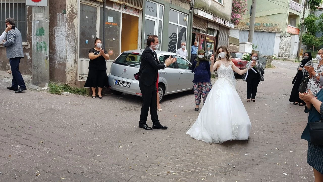 Sağlık Bakanı Fahrettin Koca’nın sosyal mesafe kurallarının hiçe sayıldığı düğünler ve asker uğurlama törenlerinden görüntüleri örnek gösterip uyarılarda bulunduğu Bursa’da bir çiftin sosyal mesafe kurallarına göre maske takarak yaptığı düğün herkese derin bir nefes aldırdı. İstenince oluyormuş dedirten görüntüler merkez Osmangazi ilçesinde kaydedildi.