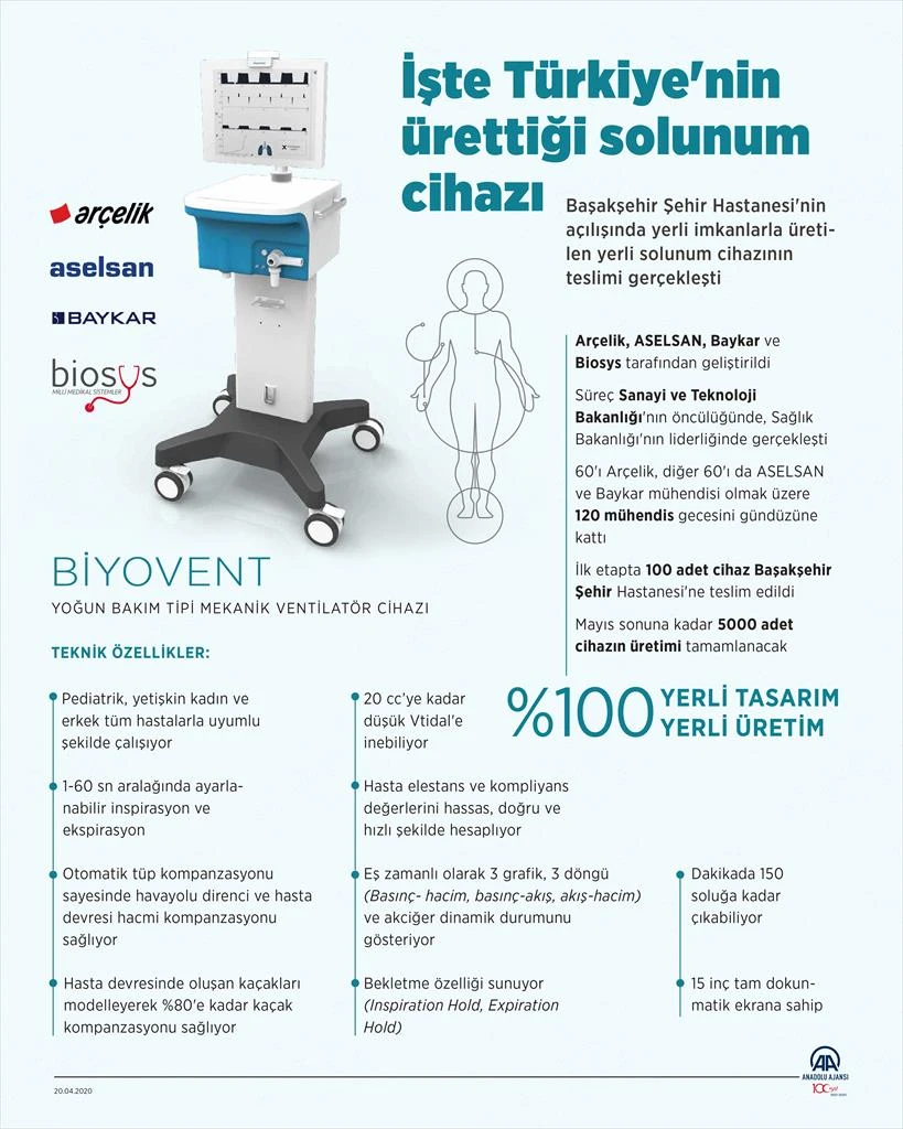 "Bu tam bir milli seferberlik ruhuyla yapıldı. 4 Türk şirketi bir araya geldi, hatta mühendislerimiz, buradaki takım arkadaşlarım, 'Bizi bir odaya kapatın, başarana kadar çıkarmayın' dediler. Tam bir seferberlik ruhuyla gerçekleşti. İnşallah da mayıs ayının sonuna kadar 5 bin adet cihazı vermiş olacağız.