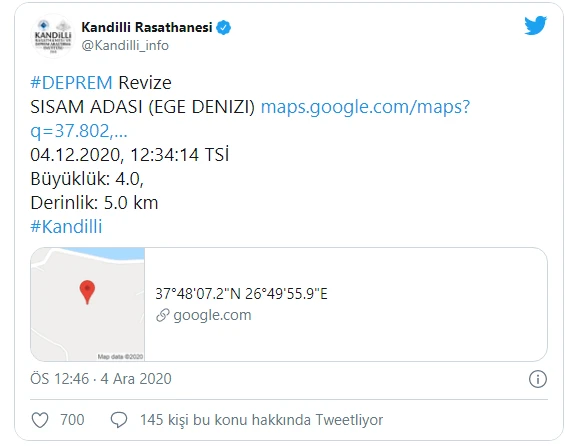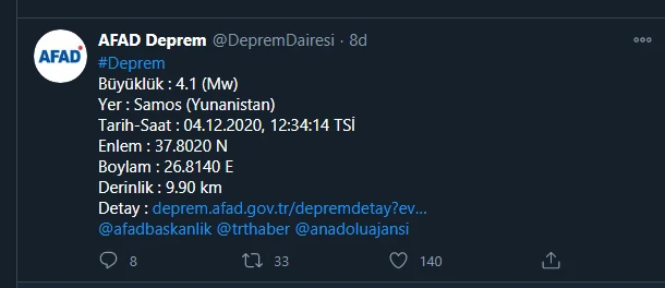 AFAD'tan bir son dakika açıklaması geldi. Açıklamaya göre deprem Yunanistan'ın Samos Adası yakınlarında 4.1 büyüklüğünde gerçekleşti.