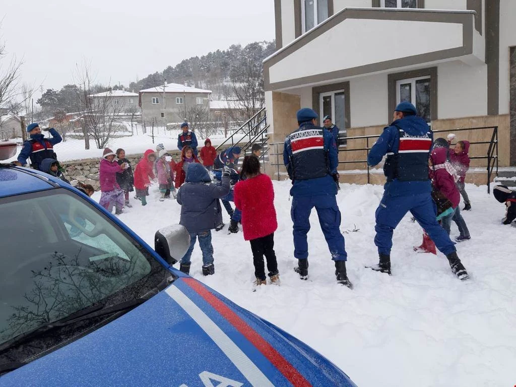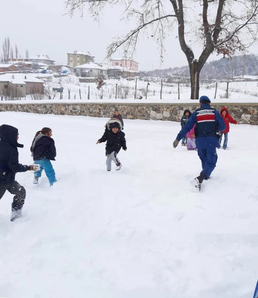Jandarma Komutanlığı personeli ile kartopu oynayıp, kardan adam yapan minik öğrenciler, kızaklarla da kayarak güzel zaman geçirdi.