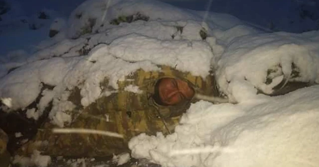 Kahraman mehmetçik kar ve tipiye rağmen vatan nöbetini sürdürüyor, zorlu şartlara aldırış etmeden terörist avına çıkıyor.. Bölgede sıcaklığın sıfırın altında 30 dereceye kadar düşmesine rağmen operasyonlara ara vermeyen Türk Silahlı Kuvvetleri, teröristlerin yuvalandığı mağaraları tek tek basıyor. Operasyon aralarında dinlenmek için uyku tulumlarına giren askerlerin çekilen fotoğrafı, mücadelenin hangi şartlarda yürütüldüğünü ortaya koydu. Sosyal medyada yayınlanan 2 fotoğrafta, askerlerin üzerinde 2 karış karın biriktiği görüldü.