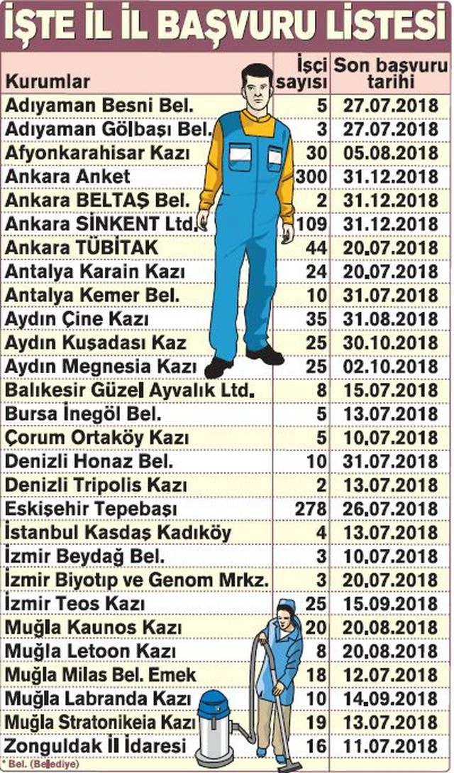 İş alımlarının bazılarında yüzde 40 engelli raporu aranırken, bazıları arasında da üniversite mezunu olma koşulu aranıyor. Yazılım geliştirmeden, sekretere, arkeologtan mimara farklı alanlarda uzman veya tecrübeli işçiler aranıyor. Başvurular İşkur’un internet sitesinden yapılabildiği gibi kurumlara şahsen de yapılabiliyor.