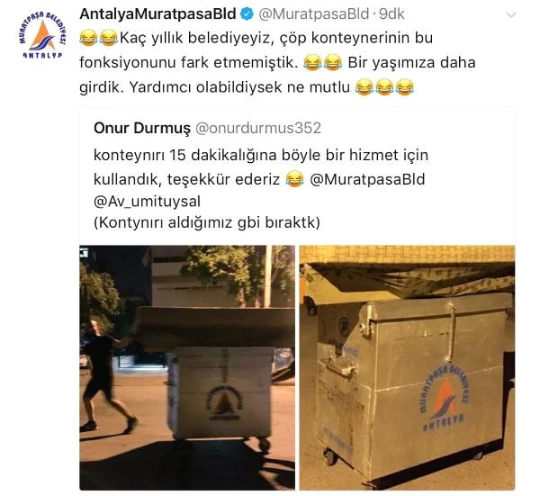 Sosyal medyada iki öğrenci ile CHP'li Muratpaşa Belediyesi'nin yazışmaları ilgi çekti. Öğrenciler, sokakta buldukları bir kanepeyi evlerine belediyeye ait çöp konteyneri ile taşıdı. Bu taşımayı fotoğraflayan öğrenciler, belediyeye "Konteyneri 15 dakikalığına böyle bir hizmet için kullandık, teşekkür ederiz. Konteyneri aldığımız gibi bıraktık" mesajı gönderdi.