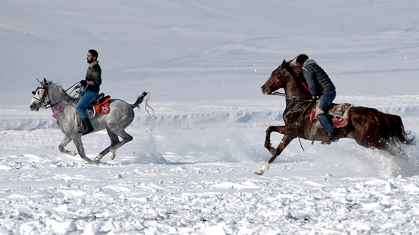 Kars'ta bazı köylerdeki vatandaşlar, atalarının yaptığı "at sırtında savaş oyunu" olarak adlandırılan cirit sporunun yaşatılması için soğuk hava ve kar yağışına aldırış etmeden atlarını sahaya sürüyor.
