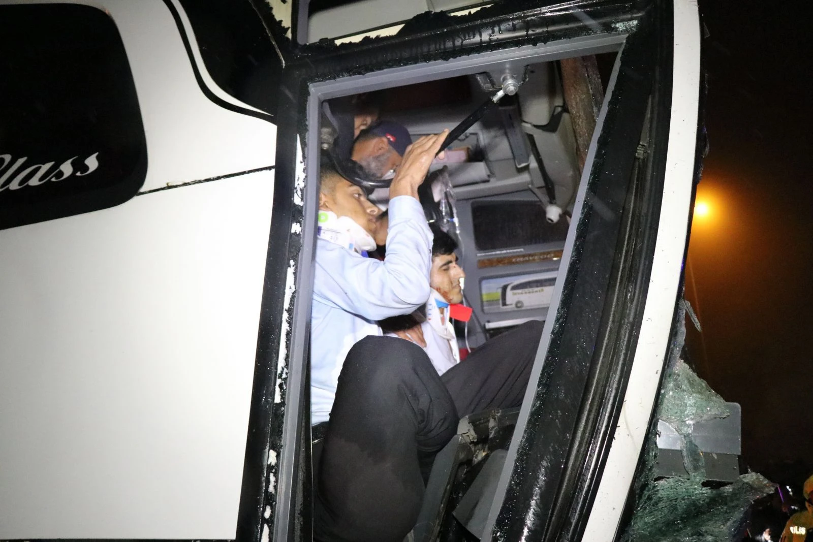 TEM’de, yolcu otobüsünün TIR'a çarpması sonucu 37 kişi yaralandı. Otobüste sıkışan soför ve muavinler için ekipler seferber oldu.
