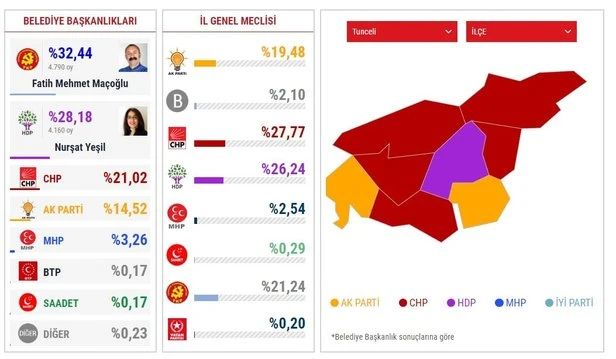 Tunceli'de seçimleri resmi olmayan sonuçlara göre Türkiye Komünist Partisi (TKP) Belediye Başkan adayı Fatih Mehmet Maçoğlu kazandı.