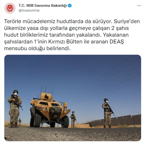 "Terörle mücadelemiz hudutlarda da sürüyor. Suriye’den ülkemize yasa dışı yollarla geçmeye çalışan 2 şahıs hudut birliklerimiz tarafından yakalandı. Yakalanan şahıslardan 1'inin Kırmızı Bülten ile aranan DEAŞ mensubu olduğu belirlendi."