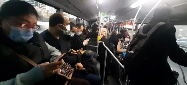 Koronavirüs tedbirleri gereği kapasitenin yarısının kullanılacağı belirtilirken yine insanlar işe geç kalma endişesi ile metrobüslerde omuz omuza yolculuk yaptılar. Sosyal mesafenin hiçe sayıldığı metrobüs yolculuklarında insanlar yoğun ortamda yine virüse davetiye çıkardılar.