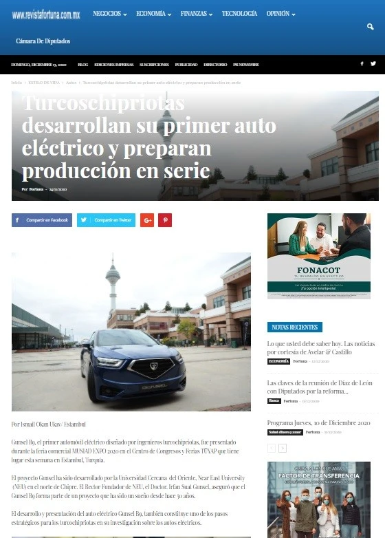 Meksika basını: “GÜNSEL B9, elektrikli otomobilinin geliştirilmesi ve tanıtımı Kıbrıslı Türklerin elektrikli otomobil konusunda stratejik bir adımı”
