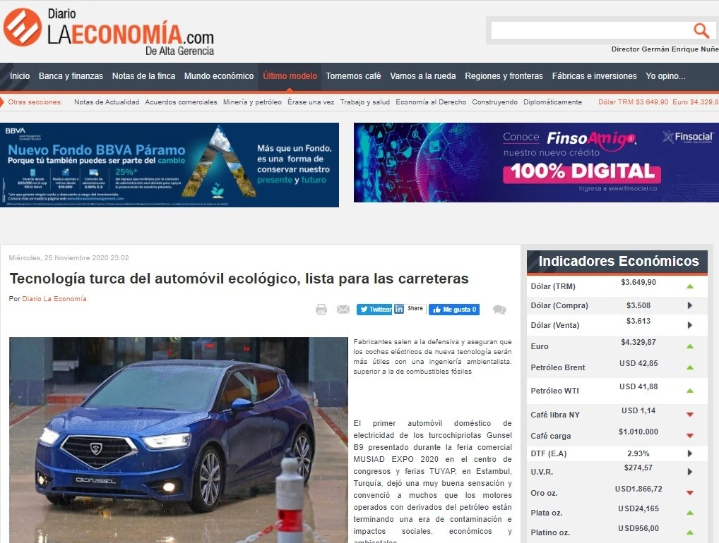 Meksika basınında ekonomi gazetesi Fortuna’da haber olan GÜNSEL, Türklerin elektrikli otomobil konusunda stratejik adımlarından biri olarak tanımlandı. GÜNSEL B9’un, tek bir şarjla 350 kilometreye kadar gidebildiğini ve sekiz saniyede 100 kilometreye kadar hızlanabildiğine vurgu yaptığı haberinde Fortuna, “GÜNSEL'in öncelikle bölge ülkelerine ve Türk devletlerine ihraç edilmesi bekleniyor” değerlendirmesini yaptı.