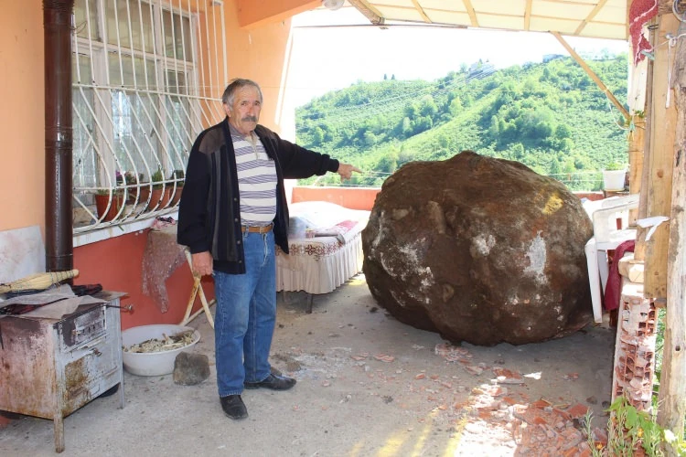 Yaklaşık 20 metrelik mesafedeki yamaçtan kopan 15-20 tonluk kaya parçası evin kapısındaki aracın üzerinden dahi zıplayarak gelip balkona konmuş. Balkondan biraz ileri yuvarlansa ardındaki odada kalıyorduk ki zarar görürdük. Allah korumuş” dedi.