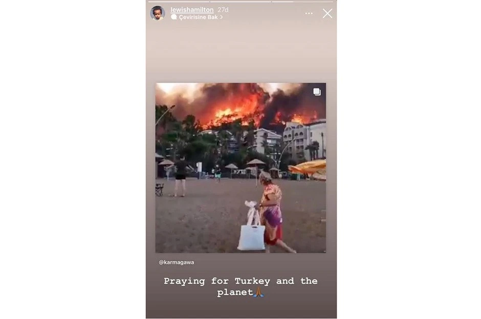 Formula 1'in İngiliz pilotu Lewis Hamilton, sosyal medya hesabından yaptığı paylaşımla orman yangınları için Türkiye'ye dua ettiğini aktardı. 36 yaşındaki Hamilton orman yangınlarıyla ilgili yaptığı paylaşımda, "Dualarım Türkiye ve gezegenle" ifadelerini kullandı.