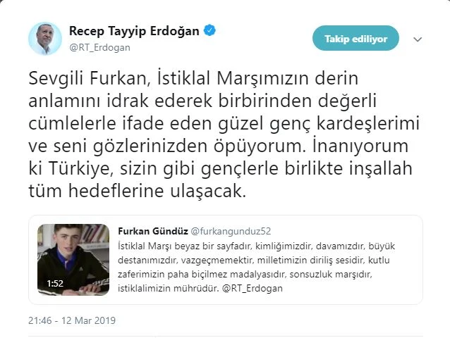 Cumhurbaşkanı Erdoğan ise Gündüz’ün paylaşımına Twitter hesabından “Sevgili Furkan, İstiklal Marşımızın derin anlamını idrak ederek birbirinden değerli cümlelerle ifade eden güzel genç kardeşlerimi ve seni gözlerinizden öpüyorum. İnanıyorum ki Türkiye, sizin gibi gençlerle birlikte inşallah tüm hedeflerine ulaşacak” şeklinde cevap verdi.