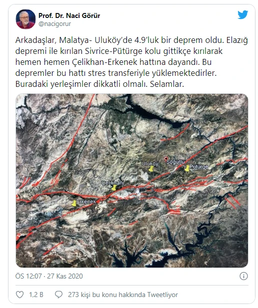 "Arkadaşlar, Malatya-Uluköy’de 4.9’luk bir deprem oldu. Elazığ depremi ile kırılan Sivrice-Pütürge kolu gittikçe kırılarak hemen hemen Çelikhan-Erkenek hattına dayandı. Bu depremler bu hattı stres transferiyle yüklemektedirler. Buradaki yerleşimler dikkatli olmalı. Selamlar."