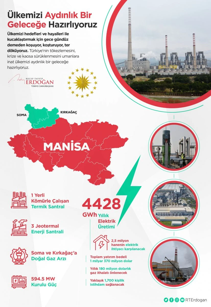 Cumhurbaşkanı Erdoğan, twitter adresinden, "Ülkemizi hedefleri ve hayalleri ile kucaklaştırmak için gece gündüz demeden koşuyor, ter döküyoruz. Manisa'da resmi açılışını gerçekleştirdiğimiz 4 enerji santrali ve Soma ile Kırkağaç'a sağlanacak doğal gaz arzının ülkemize, Manisalı kardeşlerime hayırlı olmasını diliyorum." paylaşımı yaptı.