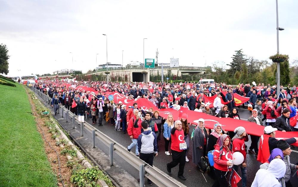 Maratona katılan 15 Temmuz şehitlerinin aileleri ve gaziler, 93 metre uzunluğunda dev bir bayrakla yürüdü.