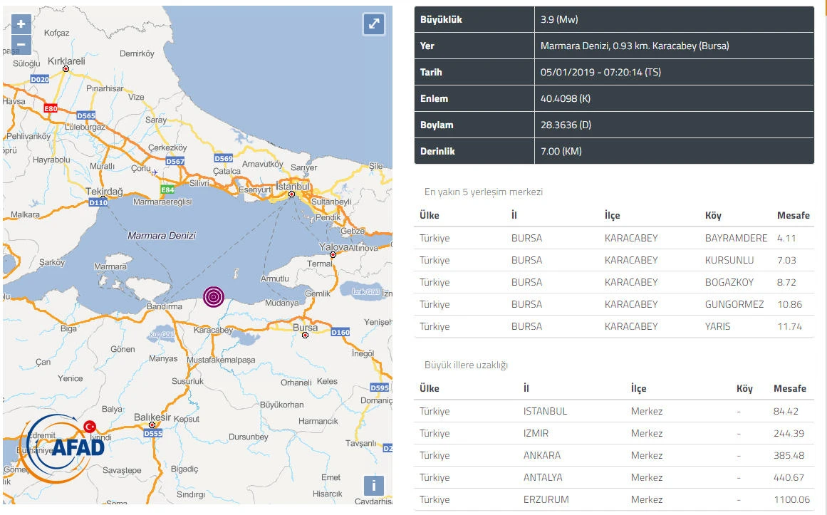 İçişleri Bakanlığı Afet ve Acil Durum Yönetimi Başkanlığı Deprem Dairesi Başkanlığı'nın merkez üssünü, Marmara Denizi'nde, Bursa'nın Karacabey ilçesi Bayramdere Mahallesi'nin 4,11 kilometre açıkları olarak saptadığı deprem, saat 07.20'de meydana geldi. Yerin 7 kilometre derinliğinde olan deprem, Bursa'nın yanı sıra Balıkesir, Yalova ve İstanbul'da da hissedildi. Deprem, kısa süreli paniğe neden oldu.