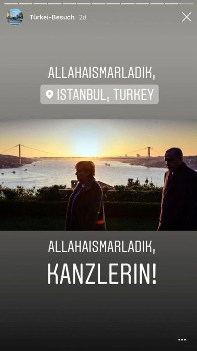 Cumhurbaşkanı Recep Tayyip Erdoğan'ın davetiyle Türkiye'ye çalışma ziyaretinde bulunan Merkel, veda ederken sosyal medya hesabı Instagram'dan 'Allahaısmarladık' notuyla Cumhurbaşkanı Erdoğan'la yürüdüğü bir İstanbul fotoğrafını paylaştı.