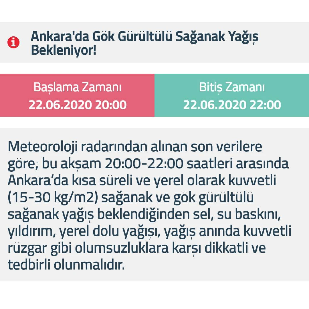 "Meteoroloji radarından alınan son verilere göre; bu akşam 20:00-22:00 saatleri arasında Ankara’da kısa süreli ve yerel olarak kuvvetli (15-30 kg/m2) sağanak ve gök gürültülü sağanak yağış beklendiğinden sel, su baskını, yıldırım, yerel dolu yağışı, yağış anında kuvvetli rüzgar gibi olumsuzluklara karşı dikkatli ve tedbirli olunmalıdır."