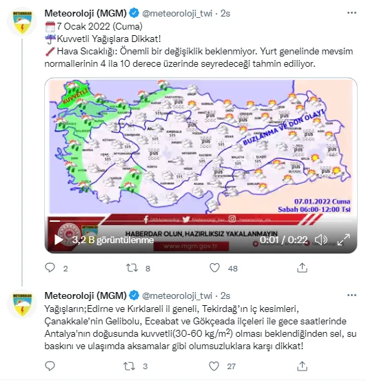 Yağışların; Edirne ve Kırklareli il geneli, Tekirdağ’ın iç kesimleri, Çanakkale’nin Gelibolu, Eceabat ve Gökçeada ilçeleri ile gece saatlerinde Antalya'nın doğusunda kuvvetli olması (30-60 kg/m2) beklendiğinden sel, su baskını ve ulaşımda aksamalar gibi olumsuzluklara karşı MGM uyardı.