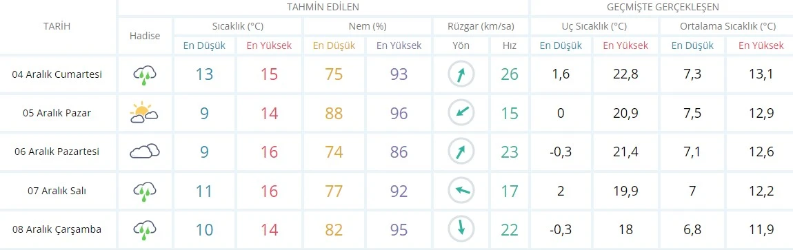 Meteoroloji, 4 Aralık Cumartesi günü ülke genelinin parçalı bulutlu ve yer yer çok bulutlu olmasının beklendiğini belirterek 12 kentte ise şiddetli yağış olacağını kaybetti. Bu illeri sarı ve turuncu kodlarla uyaran uzmanlar, Marmara, Ege, Batı Akdeniz, İç Anadolu, Batı ve Orta Karadeniz ile Malatya, Elazığ, Tunceli ve Erzincan çevrelerinin yağmur ve sağanak, Kıyı Ege ile Batı Akdeniz kıyılarının yer yer gök gürültülü sağanak yağışlı geçeceğini belirtti. Yağışların Marmara’nın batısı, Kıyı ve Güney Ege ile Antalya ve Burdur çevrelerinde kuvvetli, Güney Ege kıyılarında çok kuvvetli, Muğla çevreleri ile Aydın’ın kıyı kesimlerinde yer yer şiddetli ve aşırı olması bekleniyor.