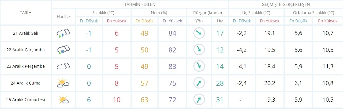 Çok bulutlu, yağmurlu zamanla karla karışık yağmurlu geçeceği tahmin ediliyor. Yağışların yükseklerinde yer yer kuvvetli kar yağışı şeklinde olması bekleniyor.