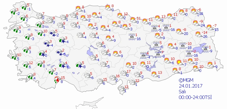 Marmara, Ege, Güneydoğu Anadolu'nun batısı ile Denizli, Uşak, Manisa, Hatay, Osmaniye ve Kahramanmaraş çevrelerinde yağmur ve sağanak, yağış alan diğer yerlerde karla karışık yağmur ve kar şeklinde olması beklenen yağışların; akşam saatlerinden sonra İzmir'in güney ve Aydın'ın kıyı kesimlerinde, gece saatlerinden itibaren ise Marmara'nın güneyi, Kıyı Ege, Yalova ve Manisa çevreleri ile Edirne ve Tekirdağ'ın güney, Kütahya'nın batı kesimlerinde kuvvetli yağmur ve sağanak şeklinde olacağı tahmin ediliyor. İç ve doğu kesimlerde buzlanma ve don olayı ile birlikte akşam ve gece saatlerinde yer yer sis ve pus hadisesi görüleceği bekleniyor.