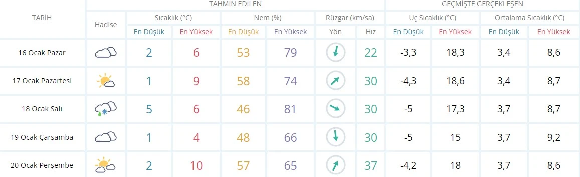 Meteoroloji Genel Müdürlüğü, 16 Ocak Pazar günü hava sıcaklığının mevsim normallerinin altında seyredeceğini ve ülke genelinin parçalı ve çok bulutlu olacağını kaydetti. armara ve İç Anadolu'nun doğusu, Karadeniz, Doğu Anadolu'nun güneydoğusu ile Çankırı ve Ardahan çevrelerinin karla karışık yağmur ve kar yağışlı, diğer yerlerin az bulutlu geçeceği tahmin ediliyor. Yağışların; Batı ve Doğu Karadeniz kıyı kesimlerinde yoğun kar şeklinde görülmesi bekleniyor. Doğu Karadeniz’in iç kesimlerinin yüksekleri ile Doğu Anadolu’nun güneydoğu kesimlerinin dik yamaçlarında çığ tehlikesi bulunmaktadır. Kuzey, iç ve doğu kesimlerde buzlanma ve don olayı ile birlikte pus ve yer yer sis görüleceği tahmin ediliyor. Hava sıcaklığının kuzey ve iç kesimlerde mevsim normallerinin 1-3 derece altında, diğer yerlerde mevsim normalleri civarında seyretmesi bekleniyor.