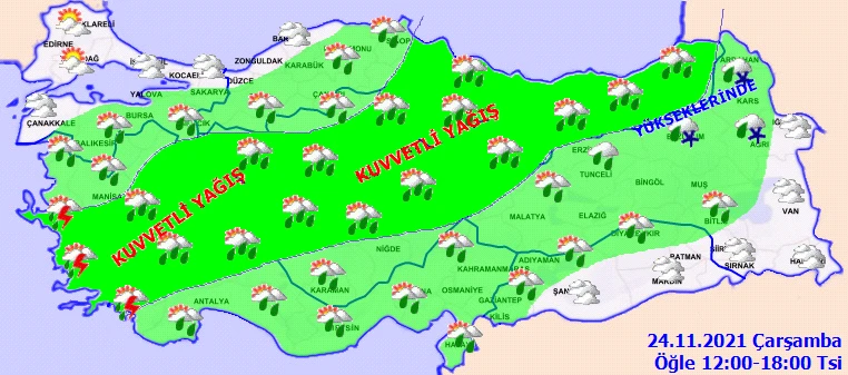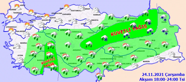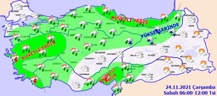 Meteoroloji Genel Müdürlüğü'nce hazırlanan 24 Kasım hava raporunda, ülke genelinin parçalı ve çok bulutlu, Trakya ile Şırnak, Hakkari ve Mardin dışında kalan bütün bölgelerin aralıklı yağışlı geçeceği belirtildi. 27 ilde sarı kodlu uyarı verilirken bu illerde yaşayan vatandaşlar için sel ve su baskınının yanı sıra yıldırım, fırtına ve dolu yağışı uyarısı da yapıldı.