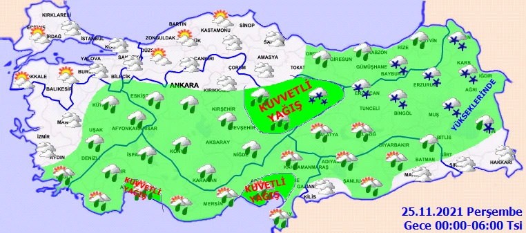 Yapılan son değerlendirmelere göre; 24 Kasım Çarşamba (bugün) günü yağmurla başlayacak yağışın zamanla yüksek kesimleri başta olmak üzere Erzincan, Gümüşhane ve Bayburt çevreleri ile akşam saatlerinden itibaren Erzurum’da yer yer kuvvetli olmak üzere kar yağışı şeklinde etkili olması beklendiğinden ulaşımda aksamalar ve buzlanma gibi olumsuzluklara karşı dikkatli ve tedbirli olunmalıdır.