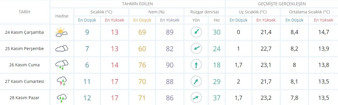 Parçalı ve çok bulutlu, aralıklı sağanak ve gök gürültülü sağanak yağışlı geçeceği tahmin ediliyor. Yağışların öğle saatlerinde ve gece saatlerinde yer yer kuvvetli olması bekleniyor.