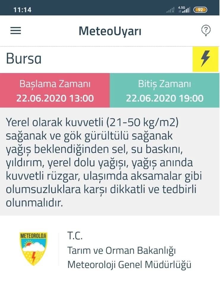 Meteoroloji Genel Müdürlüğü'nden yapılan açıklama, "Yerel olarak kuvvetli (21-50 kg/m2) sağanak ve gök gürültülü sağanak yağış beklendiğinden sel, su baskını, yıldırım, yerel dolu yağışı, yağış anında kuvvetli rüzgar, ulaşımda aksamalar gibi olumsuzluklara karşı dikkatli ve tedbirli olunmalıdır" denildi.