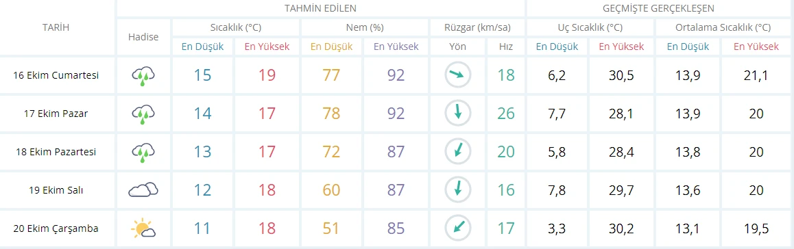 Güney kesimlerde 2-4 derece azalması beklenen hava sıcaklığı mevsim normallerine dönerken rüzgarın ise genellikle güney ve batı yönlerden, hafif, ara sıra orta kuvvette, Batı Akdeniz'in iç kesimlerinde güney ve güneybatı yönlerden kuvvetli olarak (40-60 km/saat) esmesi bekleniyor. Yağışların Marmara'nın batısı ve Kıyı Ege'de yerel olmak üzere kuvvetli olması beklendiğinden yaşanabilecek ani sel, su baskını, yıldırım, yerel dolu yağışı, yağış anında kuvvetli rüzgar ve hortum oluşma riski gibi olumsuzluklara karşı dikkatli ve tedbirli olunması gerekmektedir.