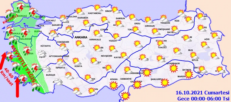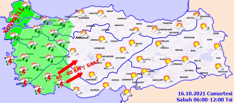 Meteoroloji tarafından kuvvetli yağış ve rüzgar uyarılarında bulunularak, vatandaşlardan dikkatli olmaları istendi. Meteoroloji’nin açıklamasında şöyle denildi. Yağışların; Marmara’nın batısı ve Kıyı Ege’de kuvvetli, İzmir’in güney ve batı ilçeleri ile Aydın’ın kıyı kesimlerinde ve Muğla çevrelerinde yerel olarak çok kuvvetli ve şiddetli olması yaşanabilecek ani sel, su baskını, yıldırım, yerel dolu yağışı, yağış anında kuvvetli rüzgar ve hortum oluşma riski gibi olumsuzluklara karşı dikkatli ve tedbirli olunması gerekmektedir. Rüzgarın; Güney Ege kıyılarında ve Batı Akdeniz’in iç kesimlerinde güney ve güneydoğu yönlerden kuvvetli ve kısa süreli fırtına şeklinde (40-70 km/saat) esmesi beklendiğinde yaşanabilecek olumsuzluklara karşı dikkatli ve tedbirli olunmalıdır.