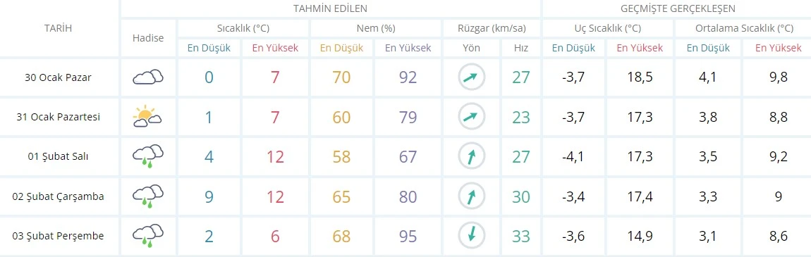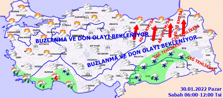 Meteoroloji'nin son değerlendirmelerine göre, 30 Ocak Pazar günü ülke genelinde etkili olması beklenen parçalı ve çok bulutlu hava, yerini yağışlara bırakacak. Güney ve İç Ege, İç Anadolu, Akdeniz, Karadeniz'in iç kesimleri, Doğu Anadolu'nun batısı, Güneydoğu Anadolu'nun kuzey ve batısı ile Bursa, Bilecik, Ordu, Giresun, Erzurum, Ağrı, Bitlis ve Muş çevrelerinin yağışlı geçeceği tahmin ediliyor. Antalya'nın doğu kesimlerinde yer yer kuvvetli olması beklenen yağışların; Güney Ege kıyıları ile Akdeniz'in kıyı kesimlerinde yağmur ve sağanak, Antalya çevrelerinde yer yer gök gürültülü sağanak, diğer yerlerde karla karışık yağmur ve kar şeklinde olacağı tahmin ediliyor. Karadeniz'in iç ve yüksek kesimleri ile Doğu Anadolu'nun kuzey ve doğusunda yüksek kar örtüsüne sahip eğimli bölgelerde çığ riski bulunmaktadır. Ülke genelinde buzlanma ve don olayı ile birlikte yer yer pus ve sis görüleceği tahmin ediliyor.
