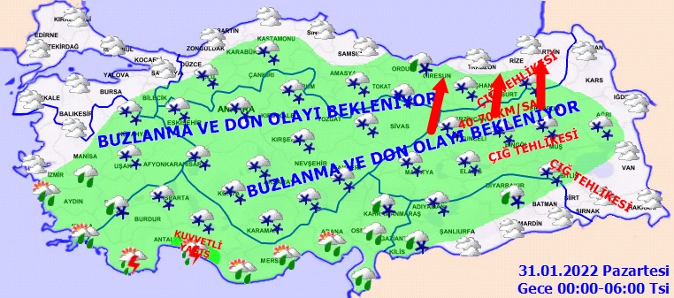 Doğu Karadeniz'in iç kesimleri ile Doğu Anadolu'nun kuzey ve doğusunda yüksek kar örtüsünün bulunduğu dik yamaçlarda çığ riski olmasından dolayı meydana gelebilecek olumsuzluklara karşı dikkatli ve tedbirli olunması gerekmektedir. Ülkemiz genelinde buzlanma ve don olayı görülmesi beklendiğinden yaşanabilecek olumsuzluklara karşı dikkatli ve tedbirli olunması gerekmektedir.