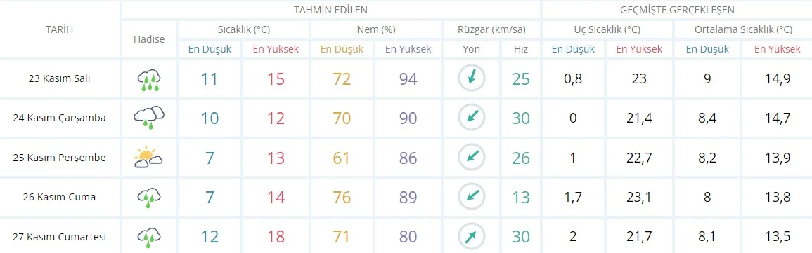 Meteoroloji Genel Müdürlüğü'nün 23 Kasım tarihli hava durum raporunda, kuzey, iç ve batı kesimlerinin parçalı, yer yer çok bulutlu olacağı bildirildi. Marmara, Ege, Batı Akdeniz, İç Anadolu'nun kuzeybatısı, Batı ve Orta Karadeniz ile Adana, Mersin, Kırşehir ve Yozgat çevrelerinin yağmur ve sağanak yer yer gök gürültülü sağanak yağışlı, diğer yerlerin parçalı az bulutlu geçeceği tahmin ediliyor.