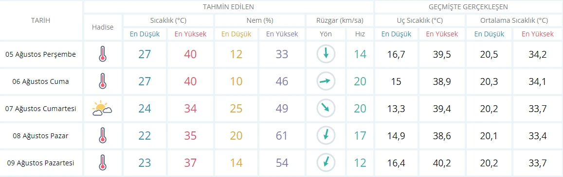 5 Ağustos Perşembe: 40 derece / Nem oranı yüzde 33 (en yüksek)